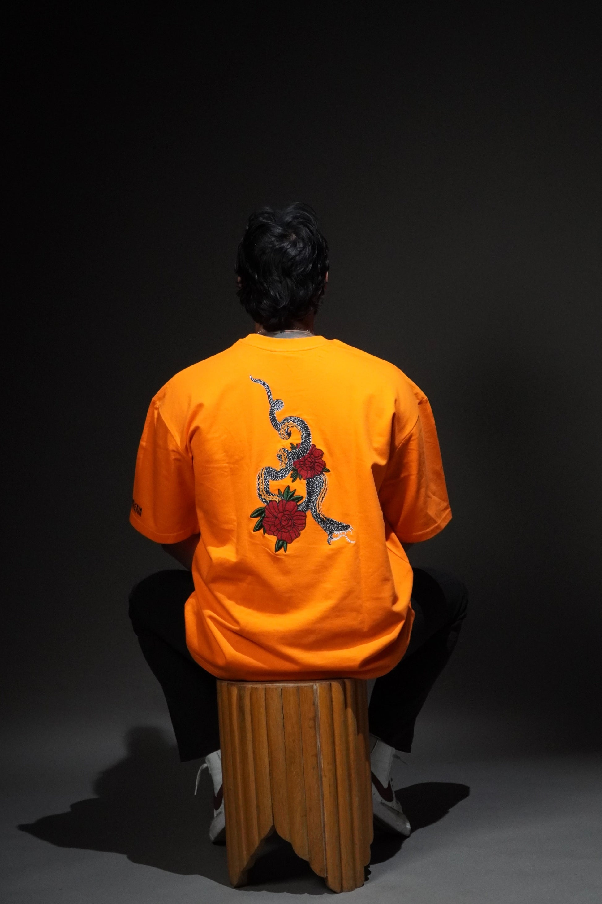 Bold, fearless, and unapologetically loud — the Slytherin House tee brings fiery energy to streetwear. Crafted from 240 GSM premium terry cotton, this piece features a striking embroidered snake and floral artwork on the back, blending edge with artistry. The bright orange base stands out while keeping comfort and style at its core.