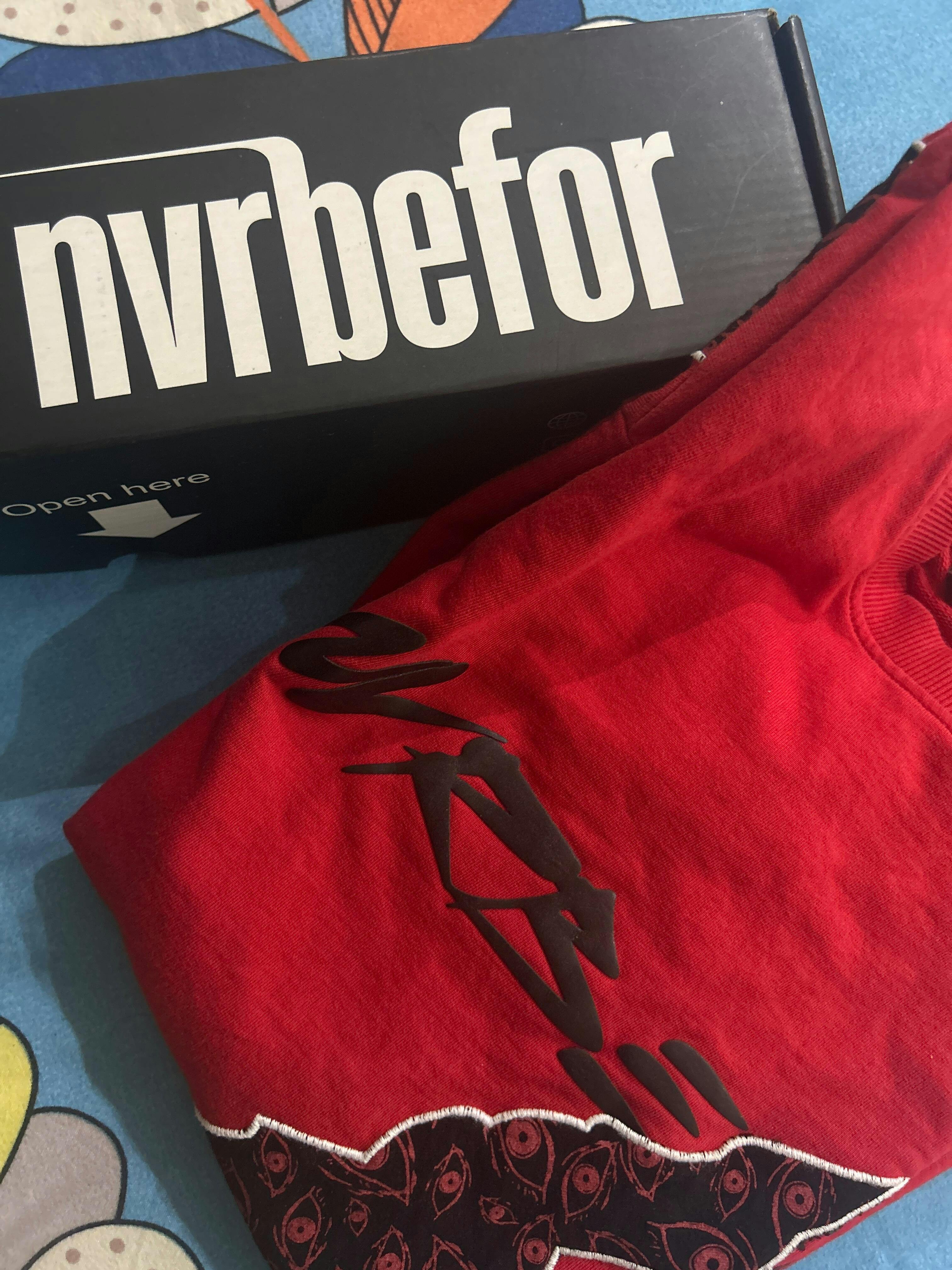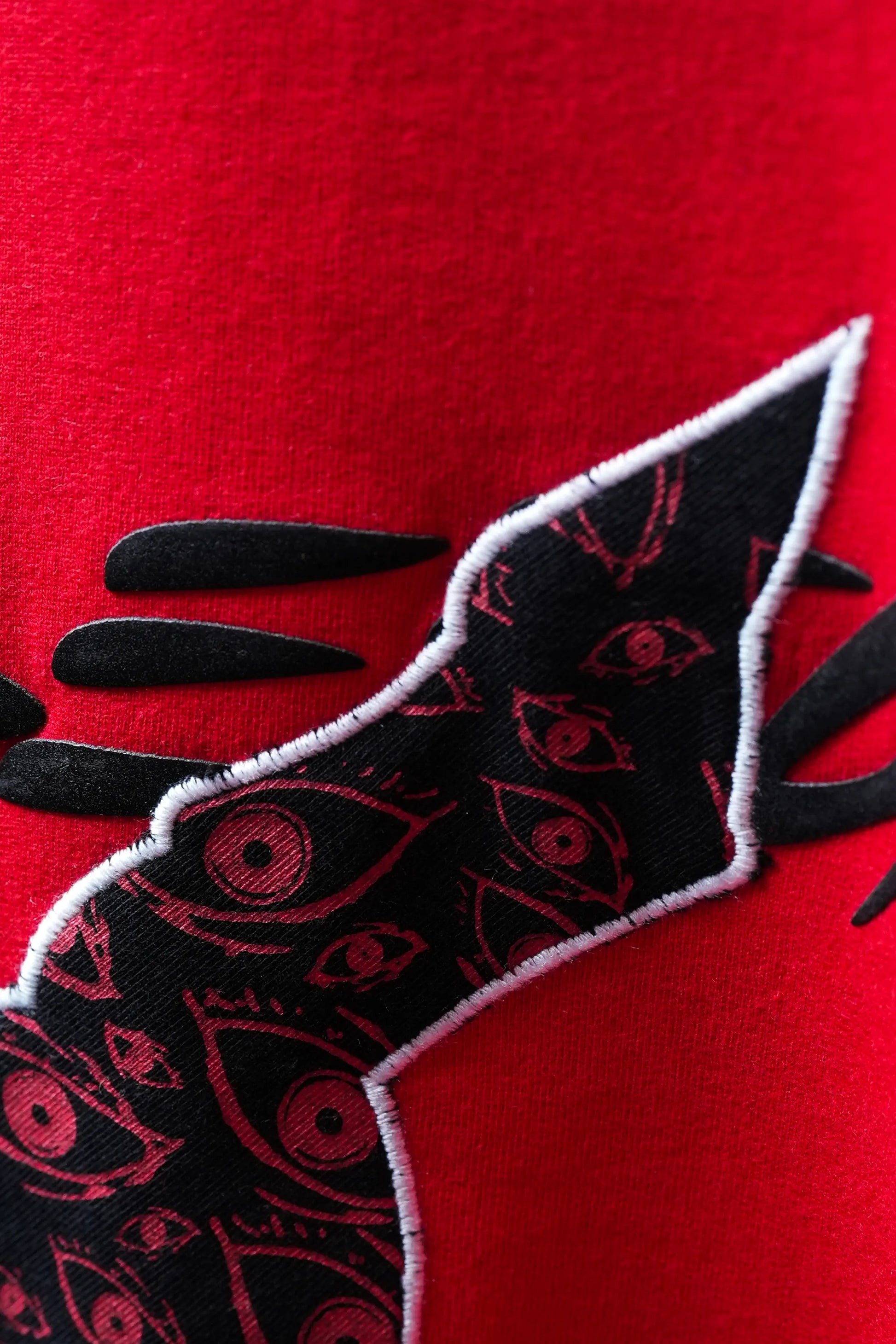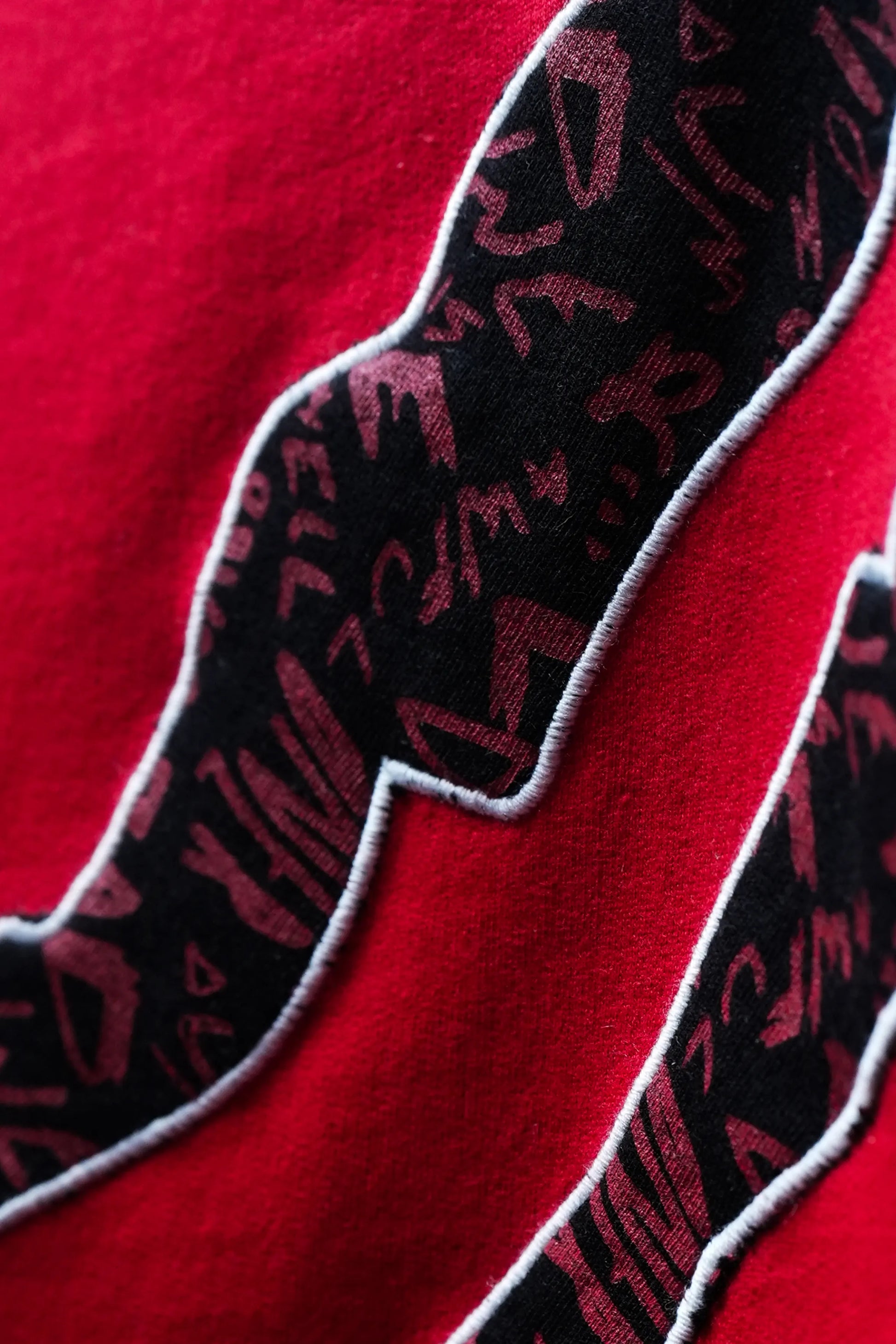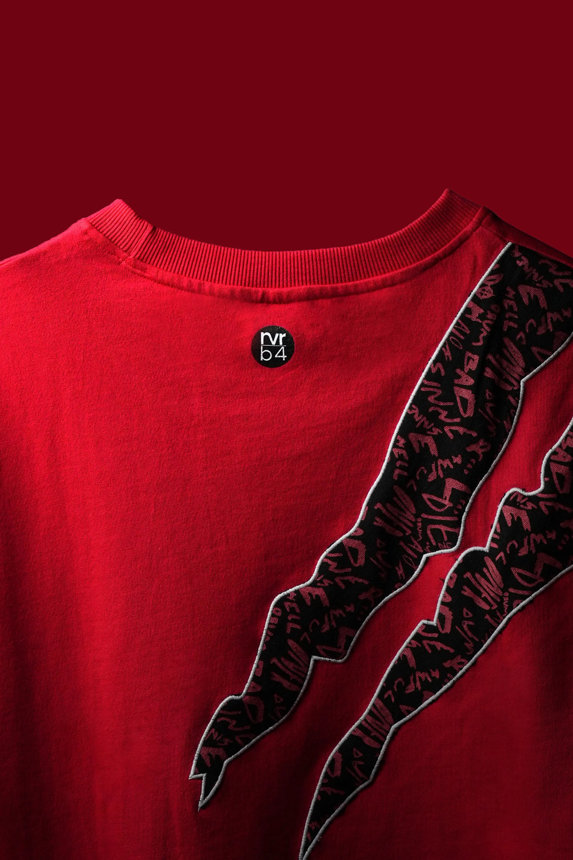 Bold blood-red oversized tee with statement screen-printed patchwork on both sides. A striking limited edition drop in 240 GSM Terry Cotton, made to stand out in any crowd.