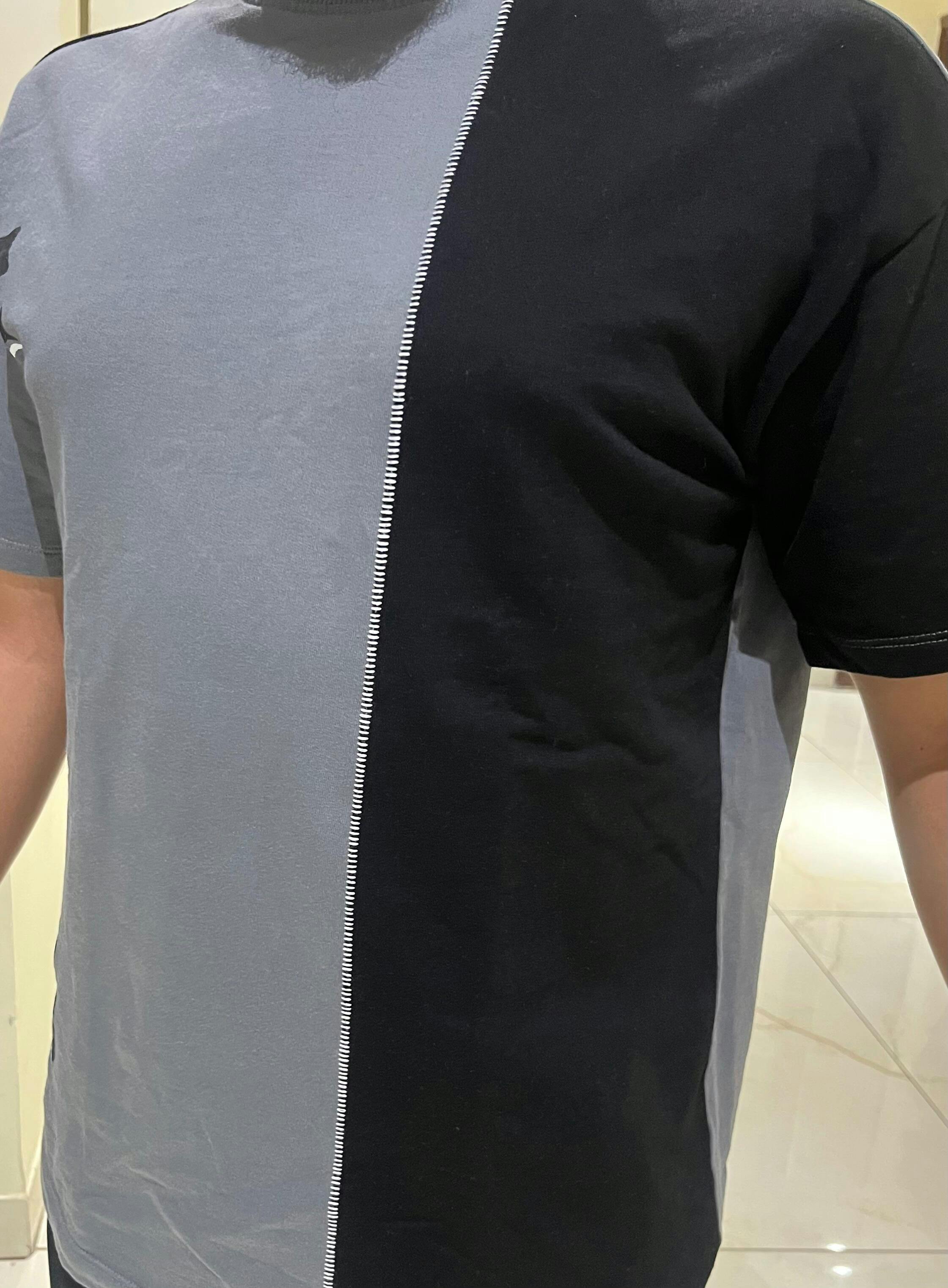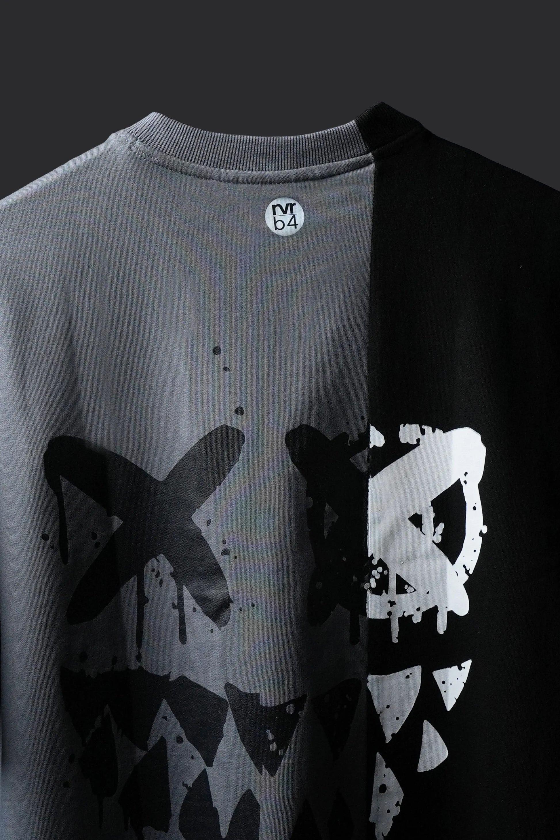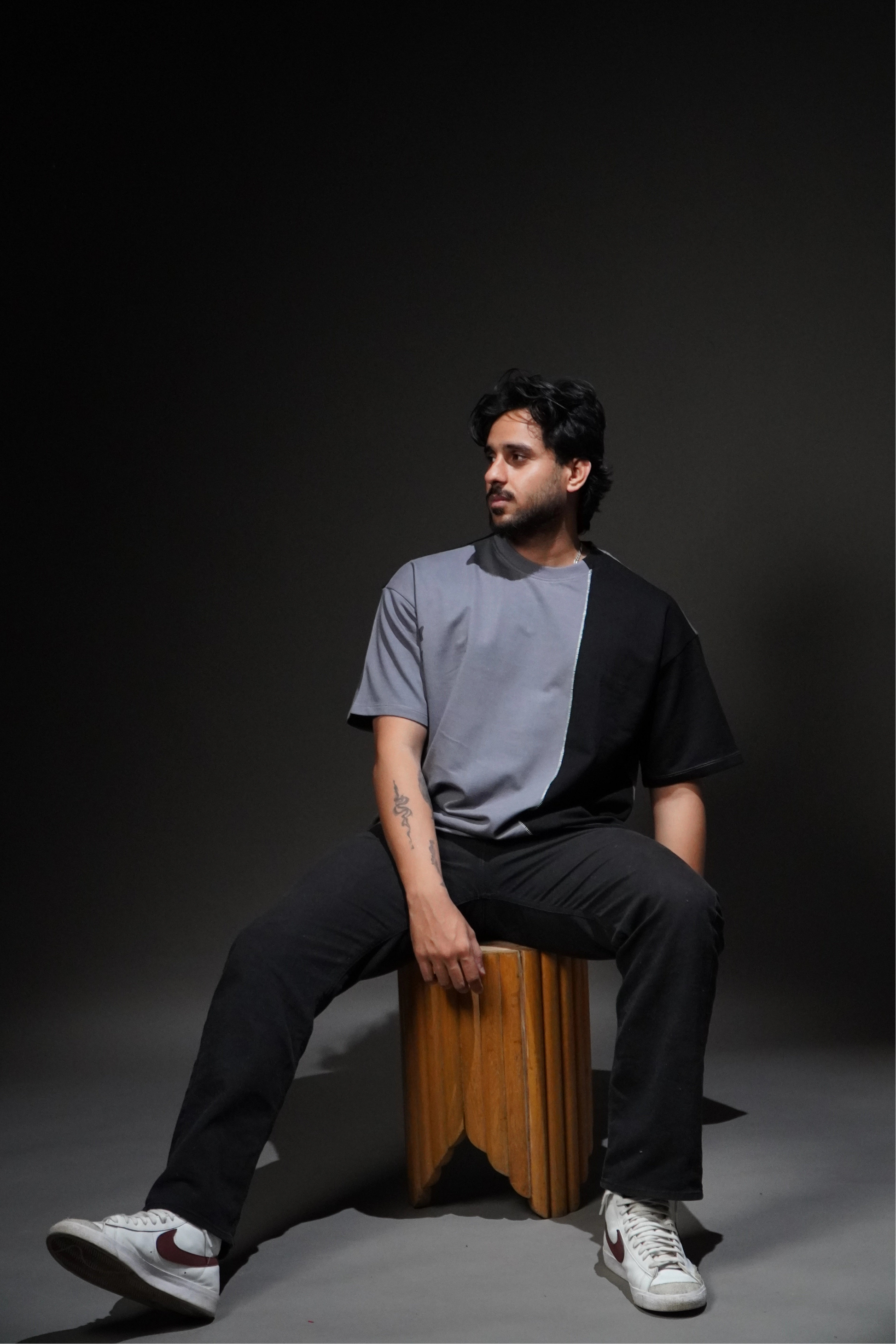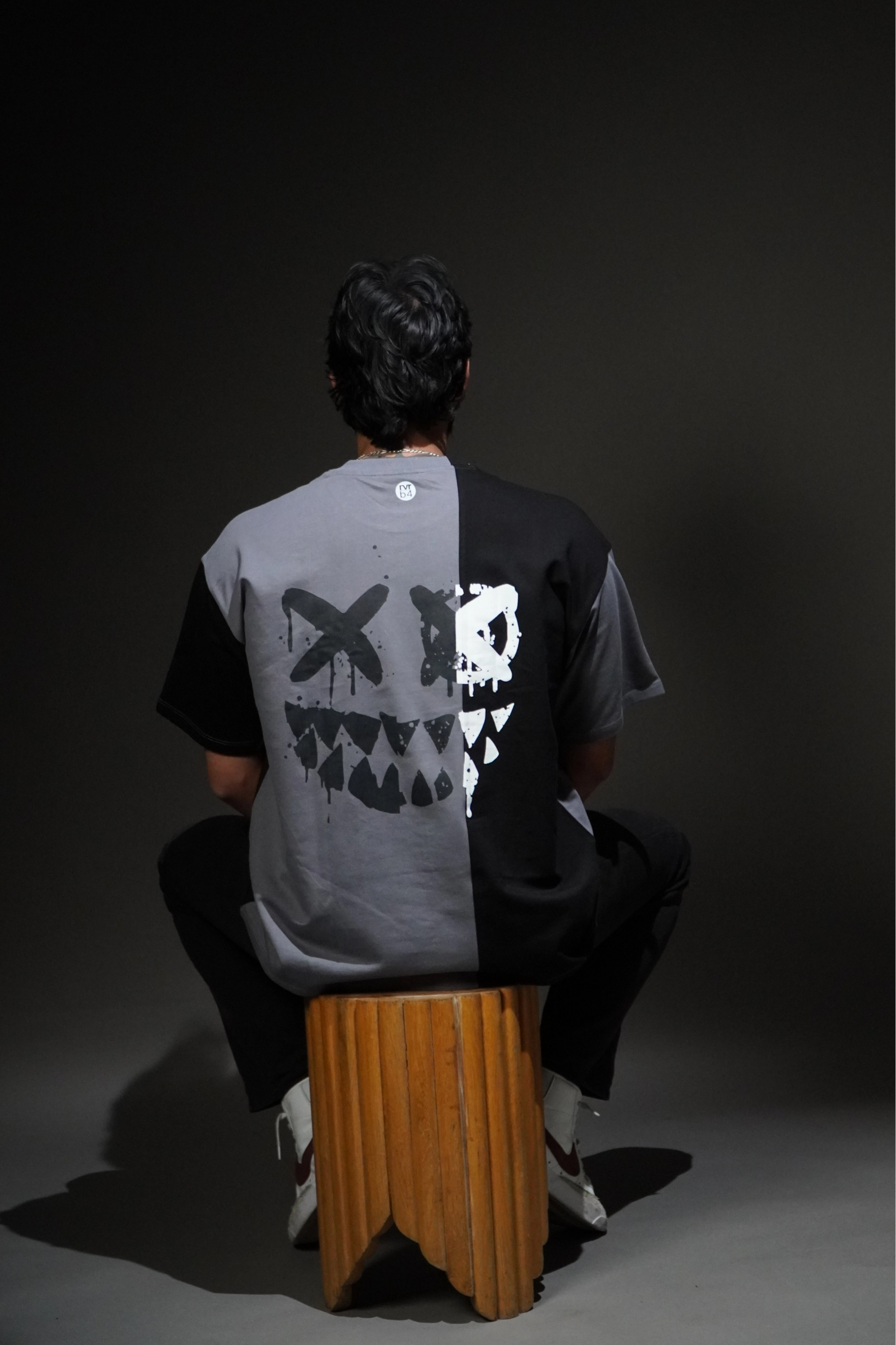 A bold fusion of light and dark — this black & grey tee brings contrast without conflict. Designed in an oversized fit and stripped-back aesthetic, it features dual-tone panels and statement screen prints front & back. Made with 240 GSM premium cotton, this piece blends comfort with attitude. Perfect for those who live in the grey, not just black or white.